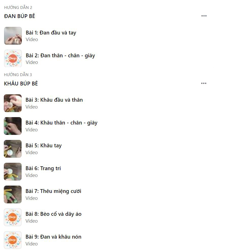 - Lớp học là dạng nhóm (group) trên facebook, đã được chia sẵn từng bài học cụ thể gồm công thức đan và video chi tiết hướng dẫn cách đan, khâu ráp, trang trí.