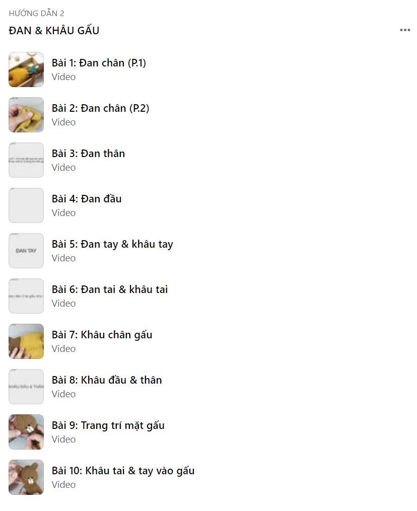 - Lớp học là dạng nhóm (group) trên facebook, đã được chia sẵn từng bài học cụ thể gồm công thức đan và video chi tiết hướng dẫn cách đan, khâu ráp, trang trí.